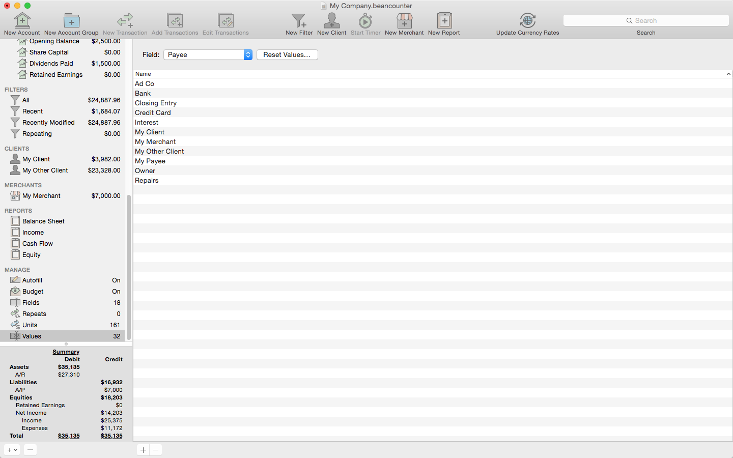 A transaction references at least two different accounts but may reference more if it is a split transaction. BeanCounter implements double-entry accounting which requires each debit to an account match a credit to another account. If a debit total is added to account 1, this results in an equal credit total added to account 2.