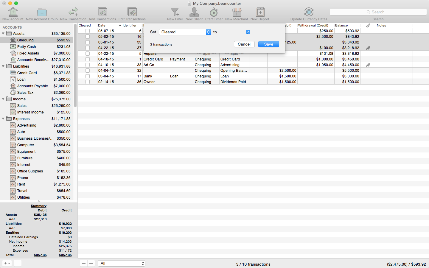 Transaction menu. To edit a transaction, double-click or select it and press the space bar or return key. To make changes to multiple transactions, select